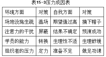 對很多非專業培訓人員來講,第一次站在講臺上授課,心理壓力是非常大的。要克服及戰勝這種障礙需要經歷一段漫長的過程。當然,精心的課前準備應該是最有效的方法,除此以外,還有一些其他的方法也可以和大家一起來分享,如表15-3所示。